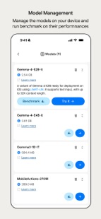 - Model Management & Benchmark: Gallery is a flexible sandbox for a wide variety of open-source models. Easily download models from the list or load your own custom models. Manage your model library effortlessly and run benchmark tests to understand exactly how each model performs on your specific hardware.