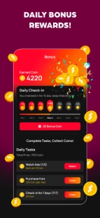 Unlock content using coins, earned by watching ads, completing tasks, or purchasing in-app.
